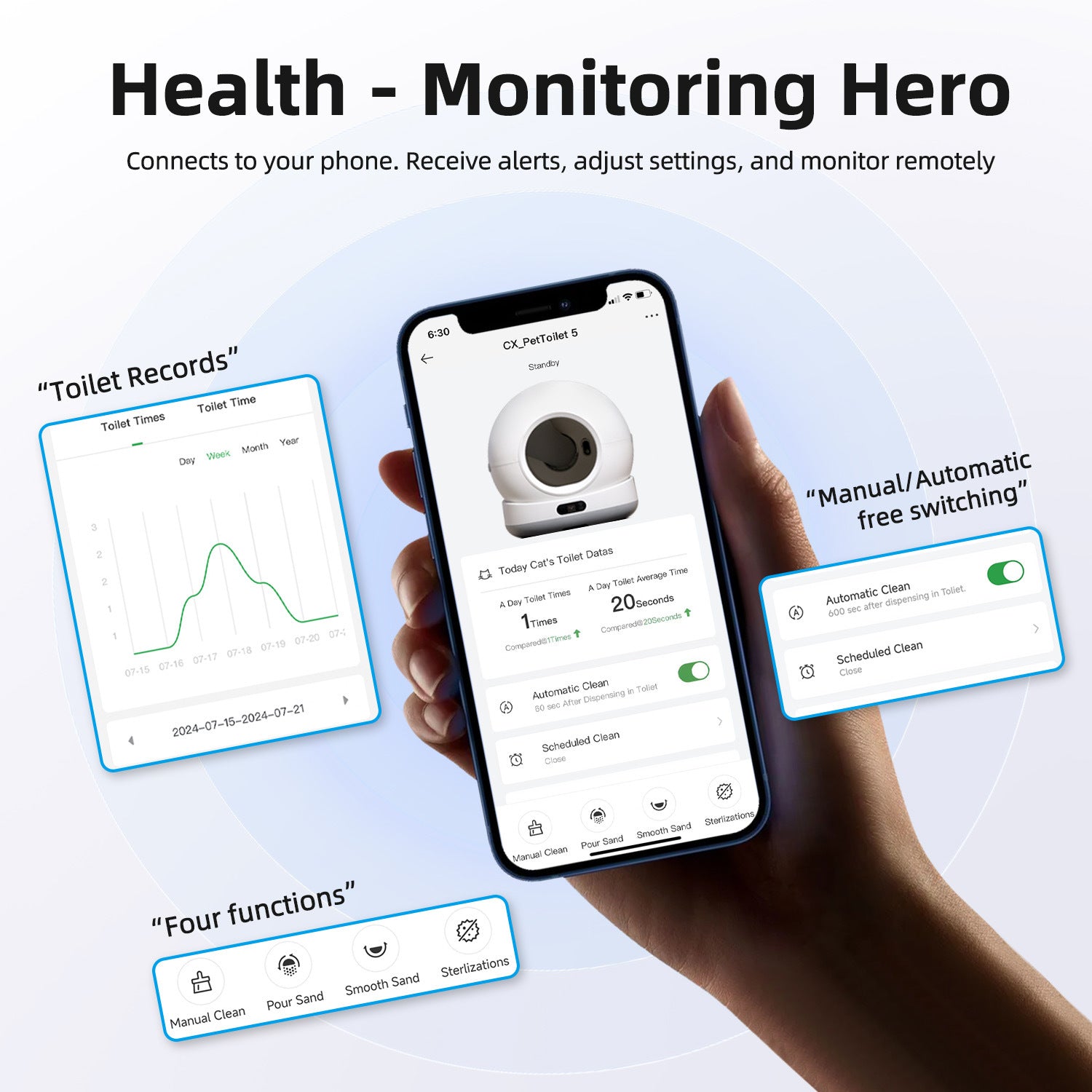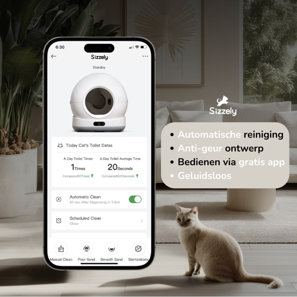 Met de bijbehorende app heb je volledige controle over de kattenbak, waar je ook bent. Start eenvoudig een reinigingscyclus met één druk op de knop of stel automatische schema’s in. Daarnaast kun je in de app gedetailleerde statistieken bekijken over het toiletgedrag en het gewicht van je kat.